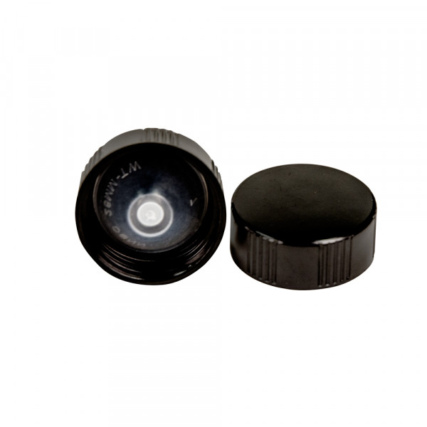 30mL Amber Wide Mouth Packer Assembled w/28-400 Black Phenolic Poly Cone Lined Cap (432/cs)