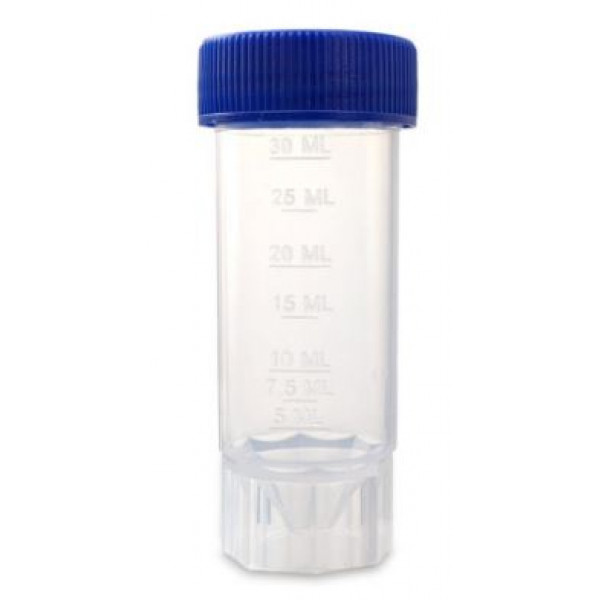 30ml PP (29 x 80mm), free standing, flat screw cap, 25/sterile bag