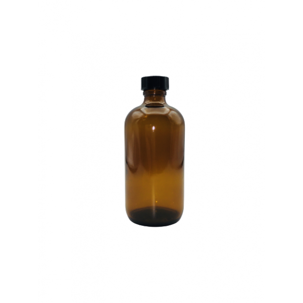 05-8BRPC121 // 8oz Amber Boston Round Assembled w/24-400 Black Phenolic Poly Cone Lined Cap (12/cs)