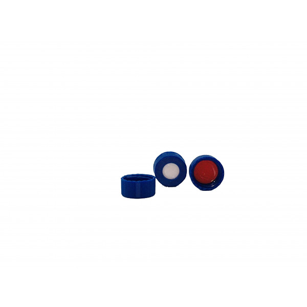 9-425 Blue PP Ribbed Threaded Cap w/Bonded 0.040" thick Red PTFE/White Silicone Septum (100/pk)