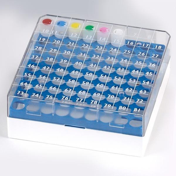 ** New Design ** BioBOX 81, for 1.0mL and 2.0mL CryoCLEAR vials, Polycarbonate (PC), Holds 81 vials (9x9 format), Printed Lid, Pack Includes a CryoClear Tube Picker, BLUE, 5/Unit
