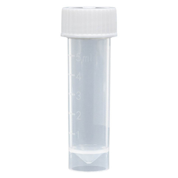 Transport Tube, 5mL, with Separate White Screw Cap, PP, Conical Bottom, Self-Standing, Molded Graduations, 1000/Unit
