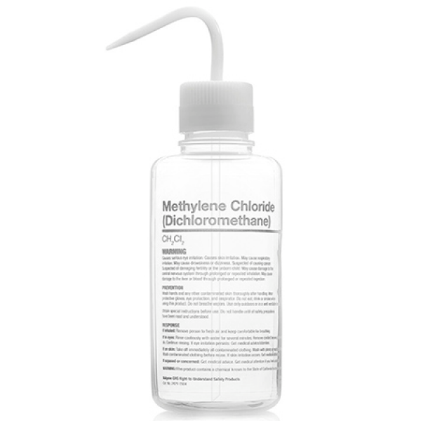 Wash Bottle, Methylene Chloride, 500mL, GHS, FEP, Vented, WHITE Screwcap, 4/Unit